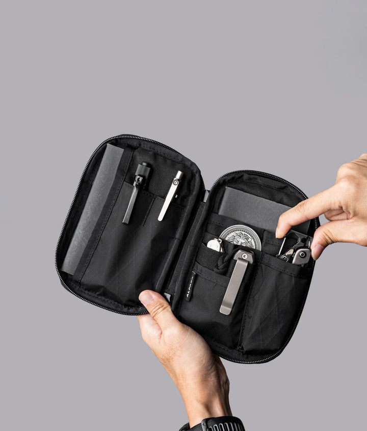 The Admin Pouch Pro keeps daily essentials like transit cards instantly accessible through external pockets, while the organized interior handles everything from notebooks to multitools. Sized to slip comfortably into pockets, it transforms scattered carry into a streamlined system.